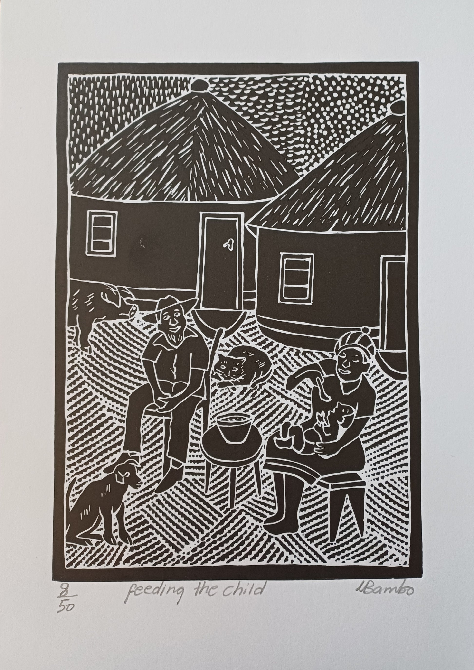 Bambo has held numerous solo exhibitions in South Africa and participated in group shows internationally, including Norway, the USA, France, Hungary, the UK, and Mexico, where he also taught for two weeks. He has received several awards, including the 1997 Volkskas Bank Atelier Award, the 1999 ABSA Bank Millennium National Art Competition, and was a finalist for the 2003 Brett Kebble Art Award. Primarily a printmaker, Bambo works in linocut at Mimi van der Merwe’s studio.