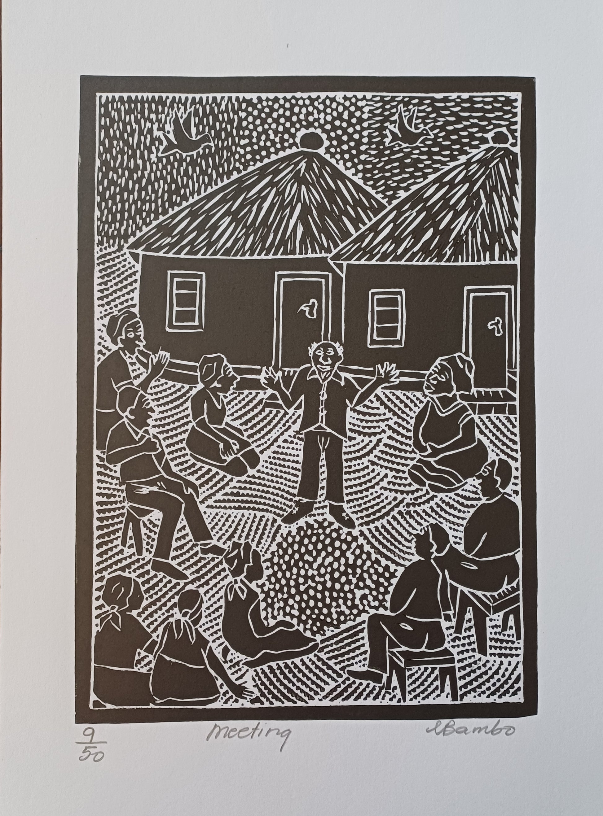 Bambo has held numerous solo exhibitions in South Africa and participated in group shows internationally, including Norway, the USA, France, Hungary, the UK, and Mexico, where he also taught for two weeks. He has received several awards, including the 1997 Volkskas Bank Atelier Award, the 1999 ABSA Bank Millennium National Art Competition, and was a finalist for the 2003 Brett Kebble Art Award. Primarily a printmaker, Bambo works in linocut at Mimi van der Merwe’s studio.