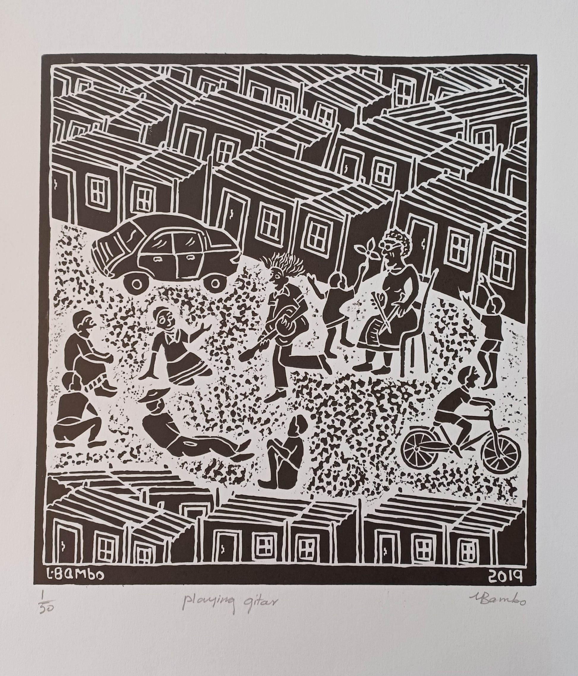 Bambo has held numerous solo exhibitions in South Africa and participated in group shows internationally, including Norway, the USA, France, Hungary, the UK, and Mexico, where he also taught for two weeks. He has received several awards, including the 1997 Volkskas Bank Atelier Award, the 1999 ABSA Bank Millennium National Art Competition, and was a finalist for the 2003 Brett Kebble Art Award. Primarily a printmaker, Bambo works in linocut at Mimi van der Merwe’s studio.