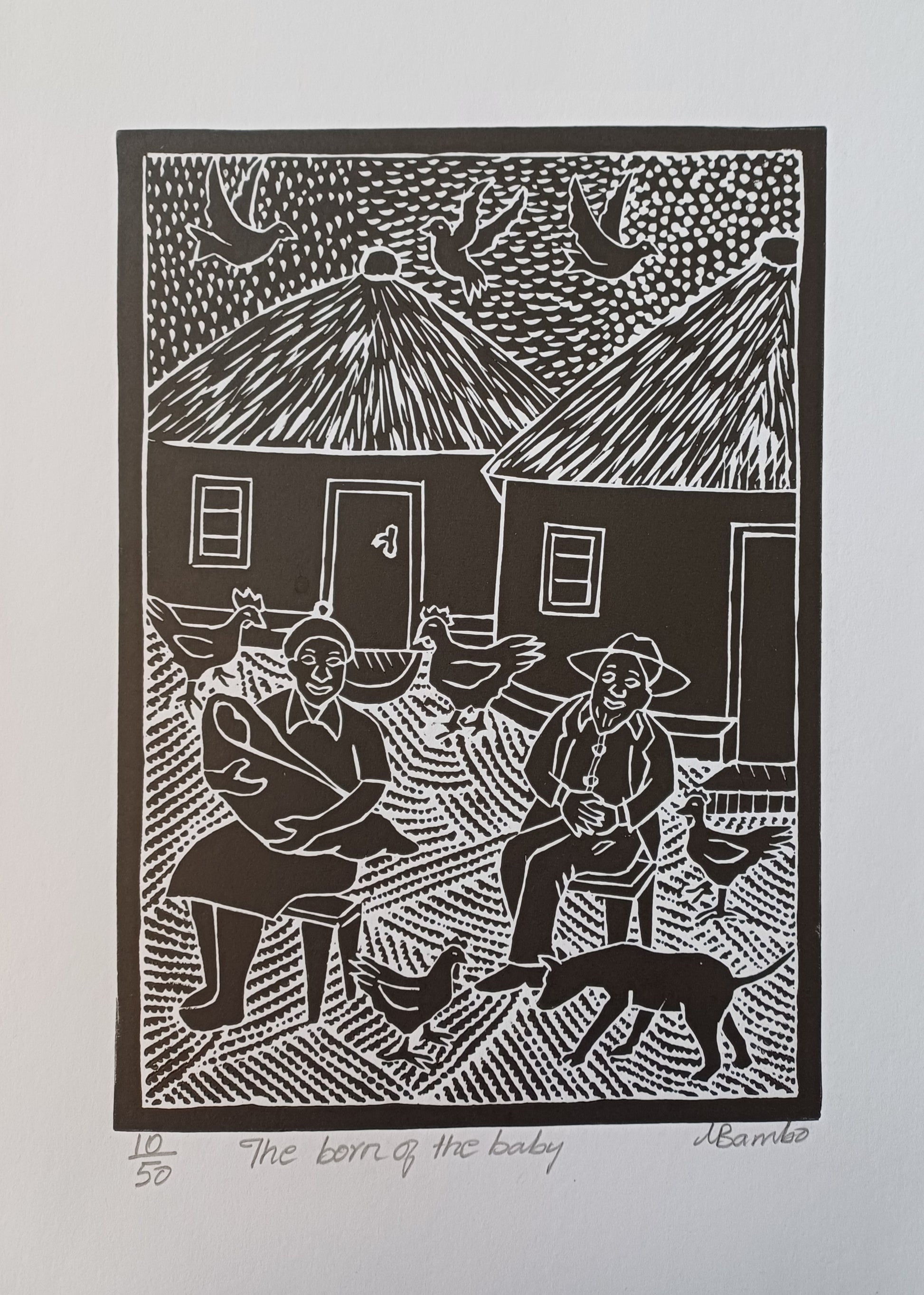 Bambo has held numerous solo exhibitions in South Africa and participated in group shows internationally, including Norway, the USA, France, Hungary, the UK, and Mexico, where he also taught for two weeks. He has received several awards, including the 1997 Volkskas Bank Atelier Award, the 1999 ABSA Bank Millennium National Art Competition, and was a finalist for the 2003 Brett Kebble Art Award. Primarily a printmaker, Bambo works in linocut at Mimi van der Merwe’s studio.