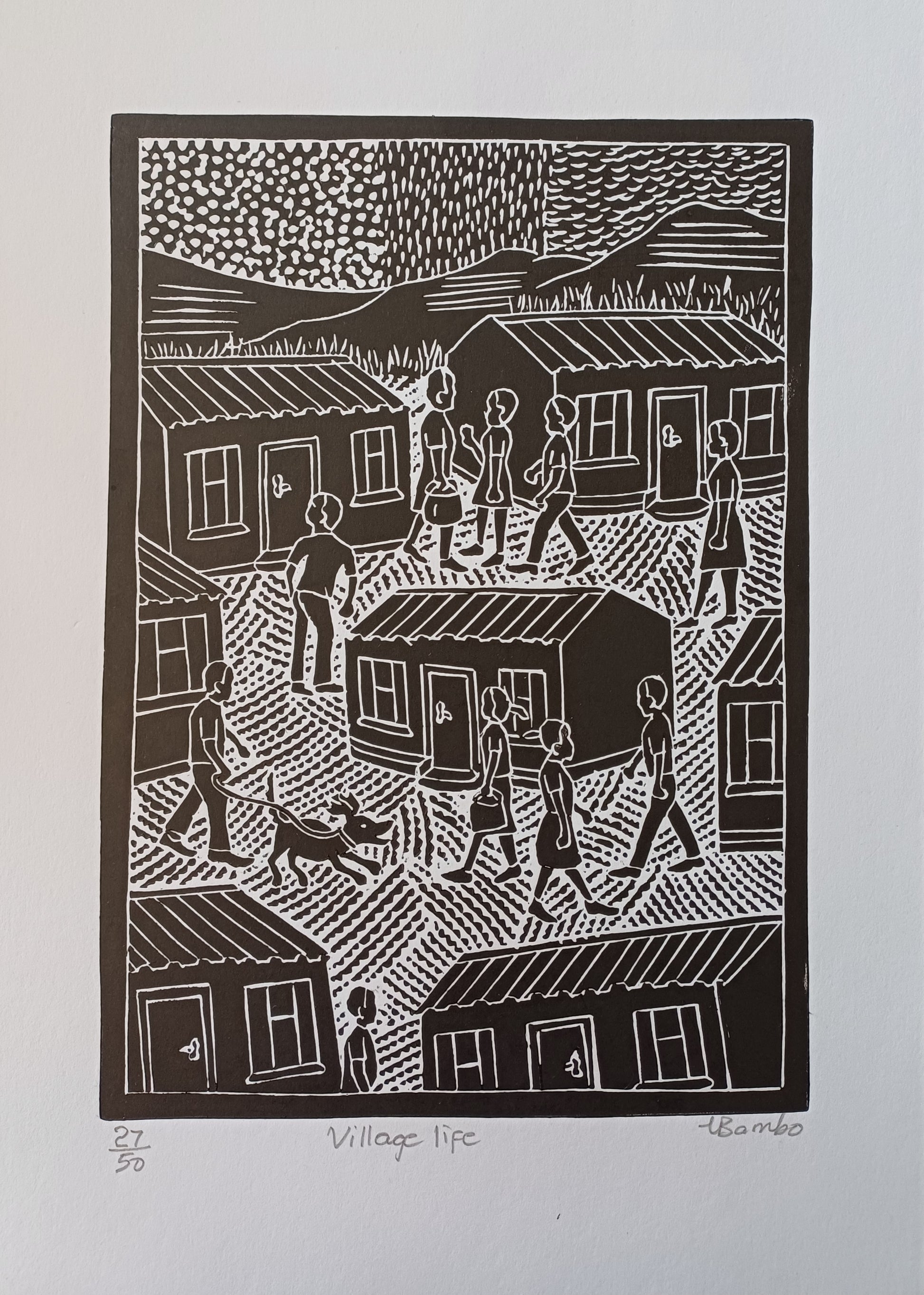 Bambo has held numerous solo exhibitions in South Africa and participated in group shows internationally, including Norway, the USA, France, Hungary, the UK, and Mexico, where he also taught for two weeks. He has received several awards, including the 1997 Volkskas Bank Atelier Award, the 1999 ABSA Bank Millennium National Art Competition, and was a finalist for the 2003 Brett Kebble Art Award. Primarily a printmaker, Bambo works in linocut at Mimi van der Merwe’s studio.