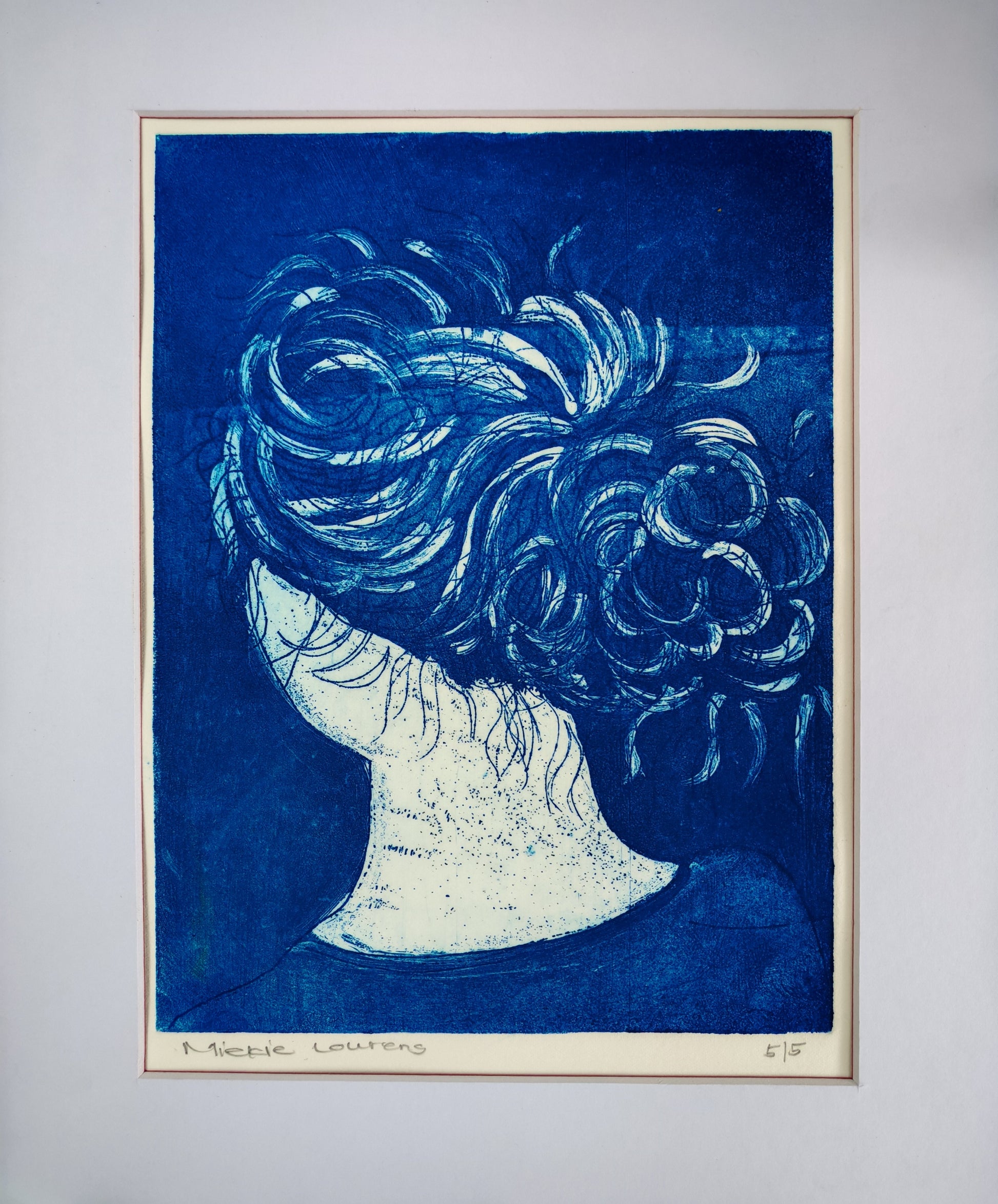Since 2021, Miekie has focused predominantly on etchings created with indigo blue ink—a poetic homage to the blue skies of South Africa, her mother’s cherished blue-and-white kitchen, and her deep, abiding love of the ocean.