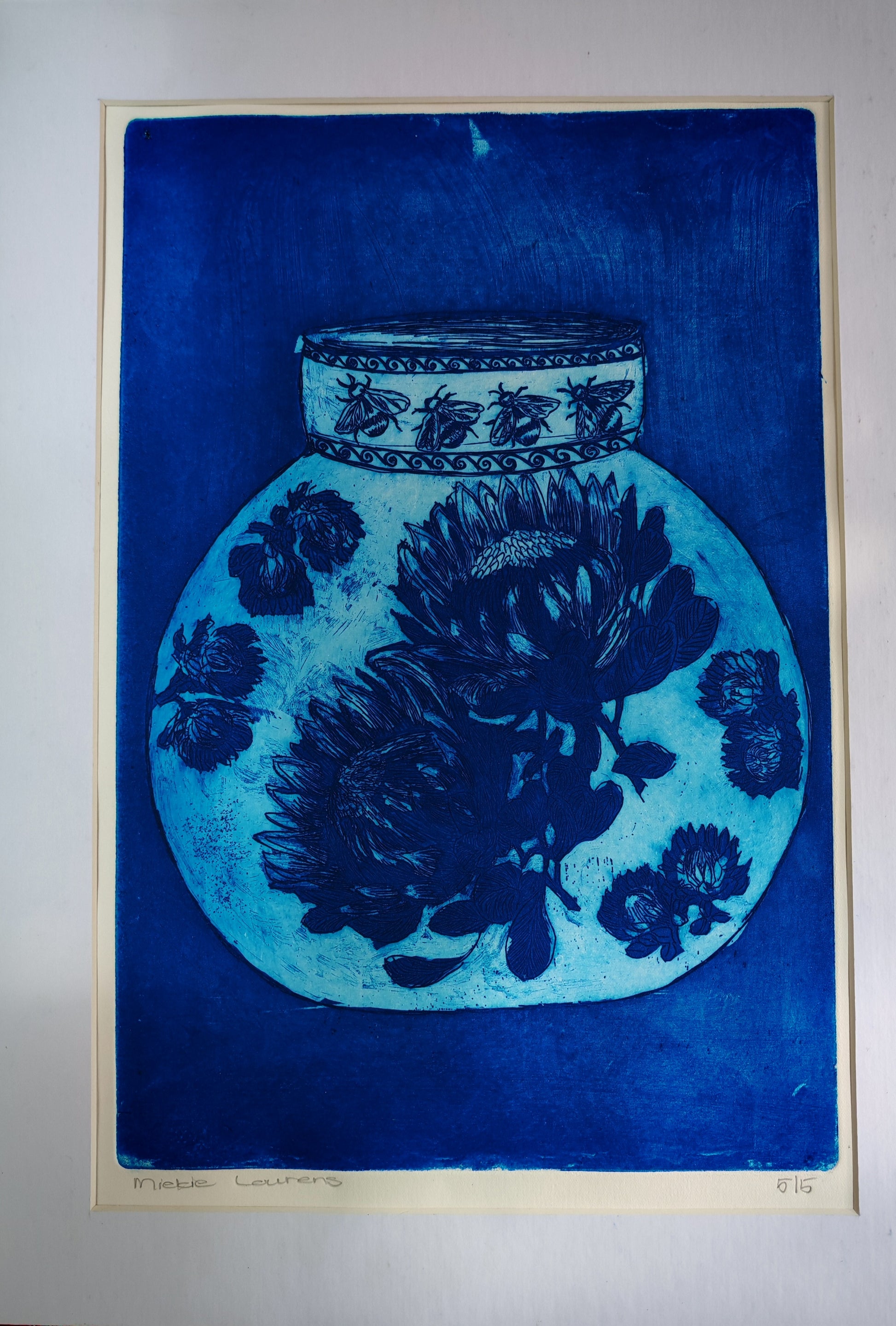 Since 2021, Miekie has focused predominantly on etchings created with indigo blue ink—a poetic homage to the blue skies of South Africa, her mother’s cherished blue-and-white kitchen, and her deep, abiding love of the ocean.