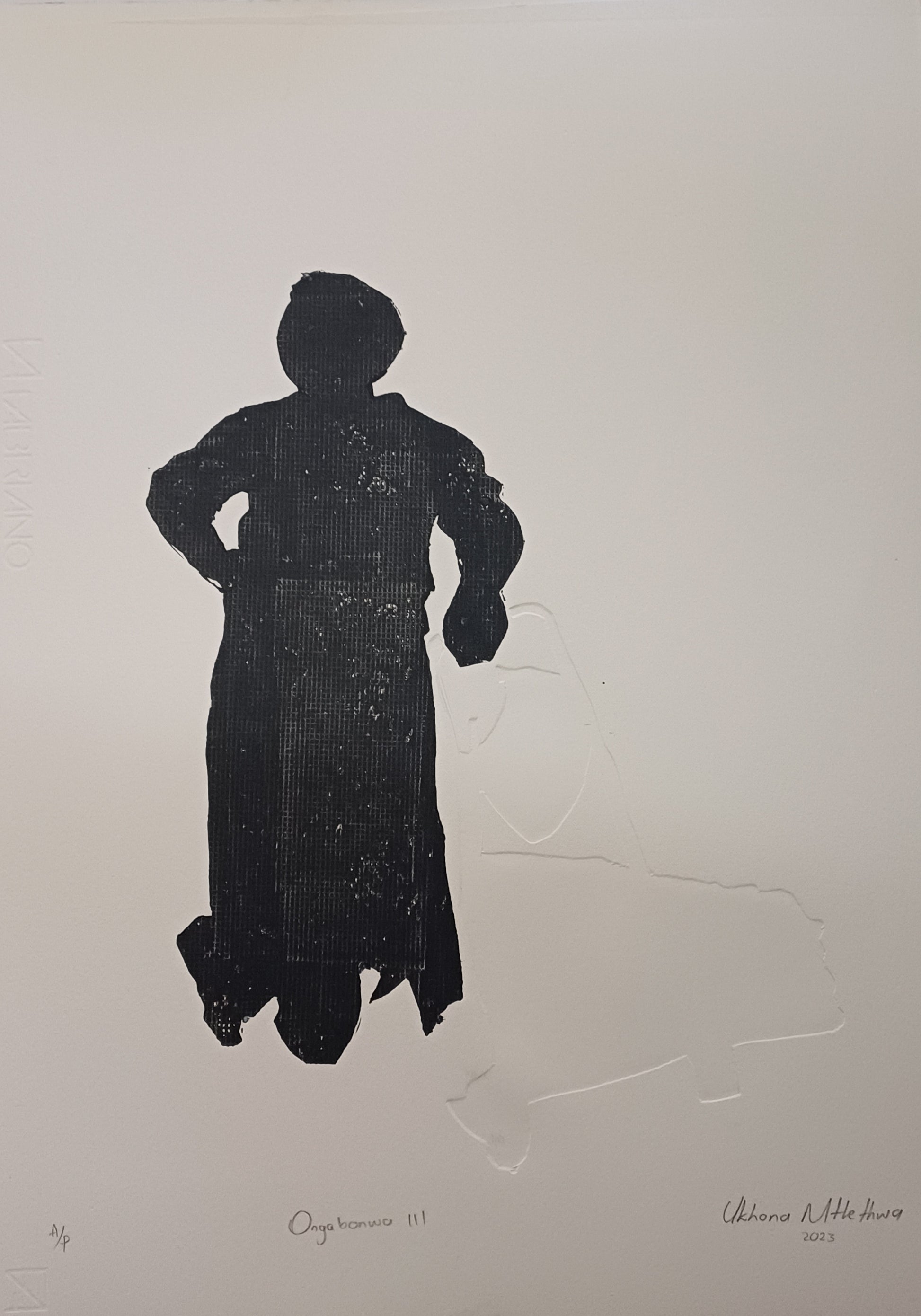 Linocut Embossing on Fabriano paper - 34 x 50 cm - Ukhona Mthethwa’s artistic practice is grounded in the exploration of Blackness as a complex and dynamic condition, intricately interwoven with themes of spirituality, migration, freedom, and liberation. Through painting—his primary medium—Mthethwa employs recurring metaphors such as the bag and the boat to articulate the spiritual and material dimensions of Black existence. These symbols serve as conceptual vessels through which he examines the historical and contemporary experiences of displacement, resilience, and survival within the African and diasporic contexts.